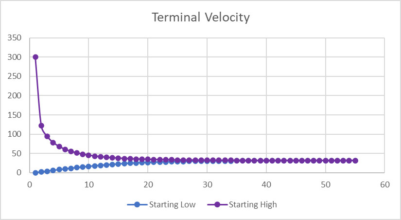 The graph below is constructed by a XLS simulation. Give the values of acceleration due to gravity and the drag force, regardless of the initial velocity, 0 or say 300, the object will tend towards a stable velocity.